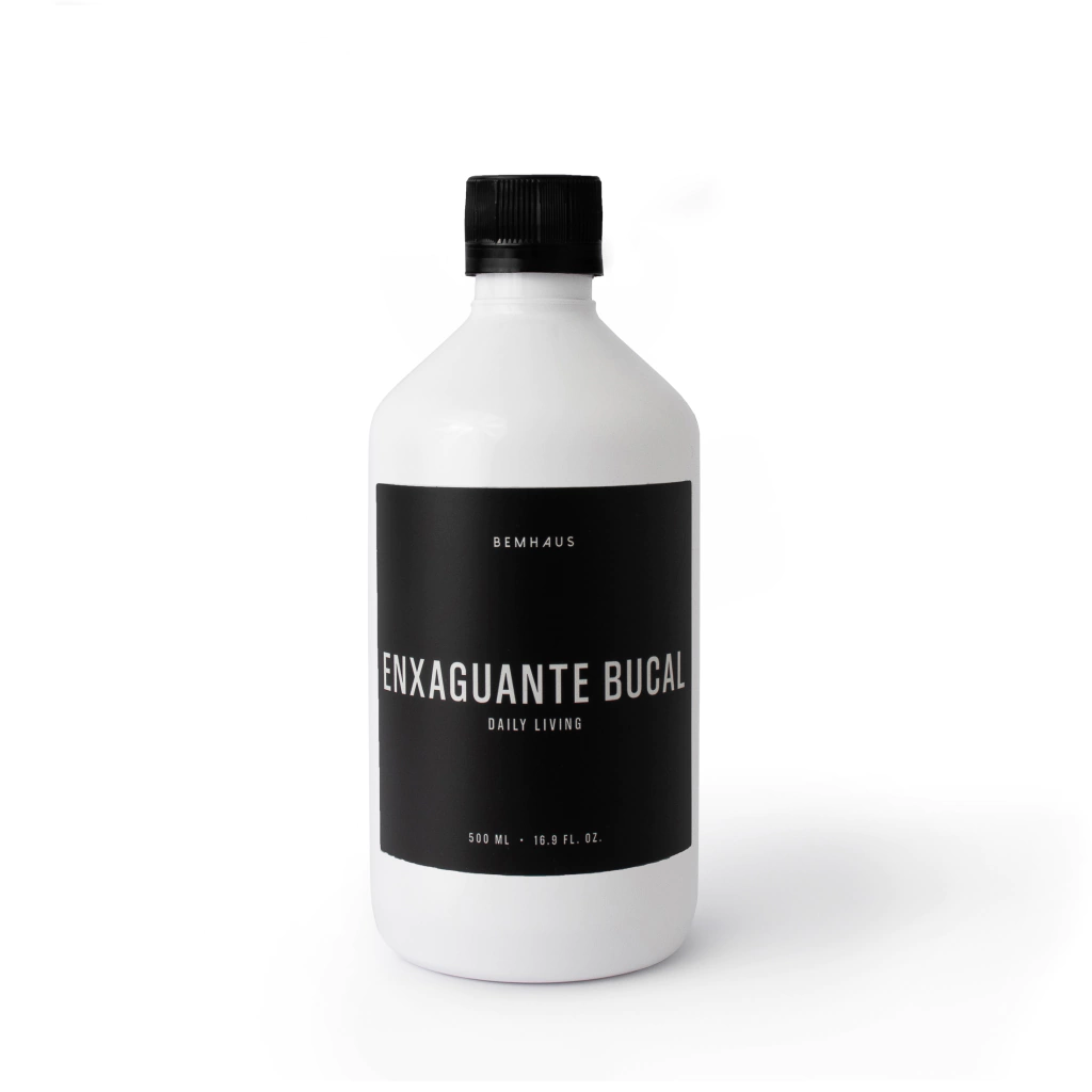 Etiqueta "Enxaguante Bucal" preta fosca que suporta contato com água.
