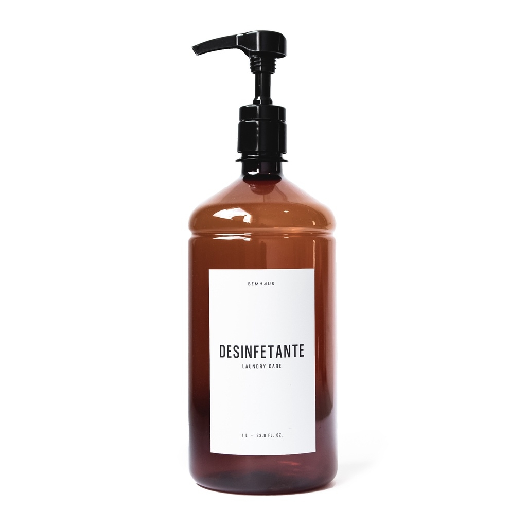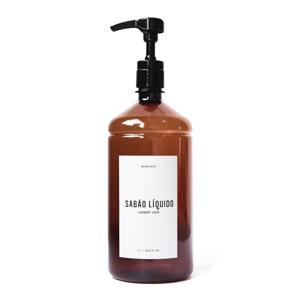 Kit Lavanderia com 5 frascos de plástico ambar sendo 4 com válvula de alta vazão e um com válvula borrifadora.
